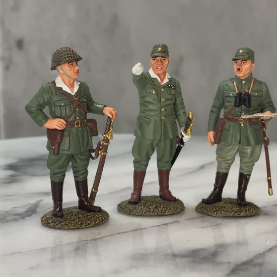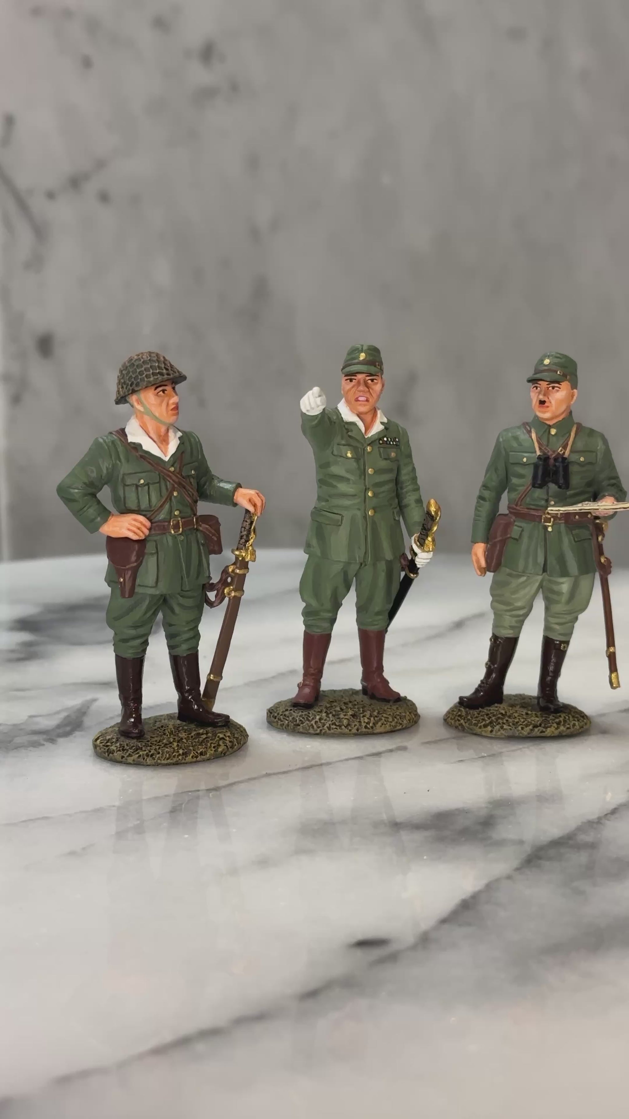 This striking three-figure set features key command figures of the Imperial Japanese Army during World War II. At the center stands General Masaharu Homma, the commander of the 1941 Philippines invasion(Hung for warcrimes), portrayed giving orders with a firm gesture. Flanking him are two subordinate officers: an Aide de Camp with a mapcase, likely relaying tactical updates, and a Regimental Commander, calmly observing the situation with sword and rifle in hand. Each figure is detailed with authentic uniforms, insignia, and facial expressions that evoke the rigid formality and authority of Japanese military command.