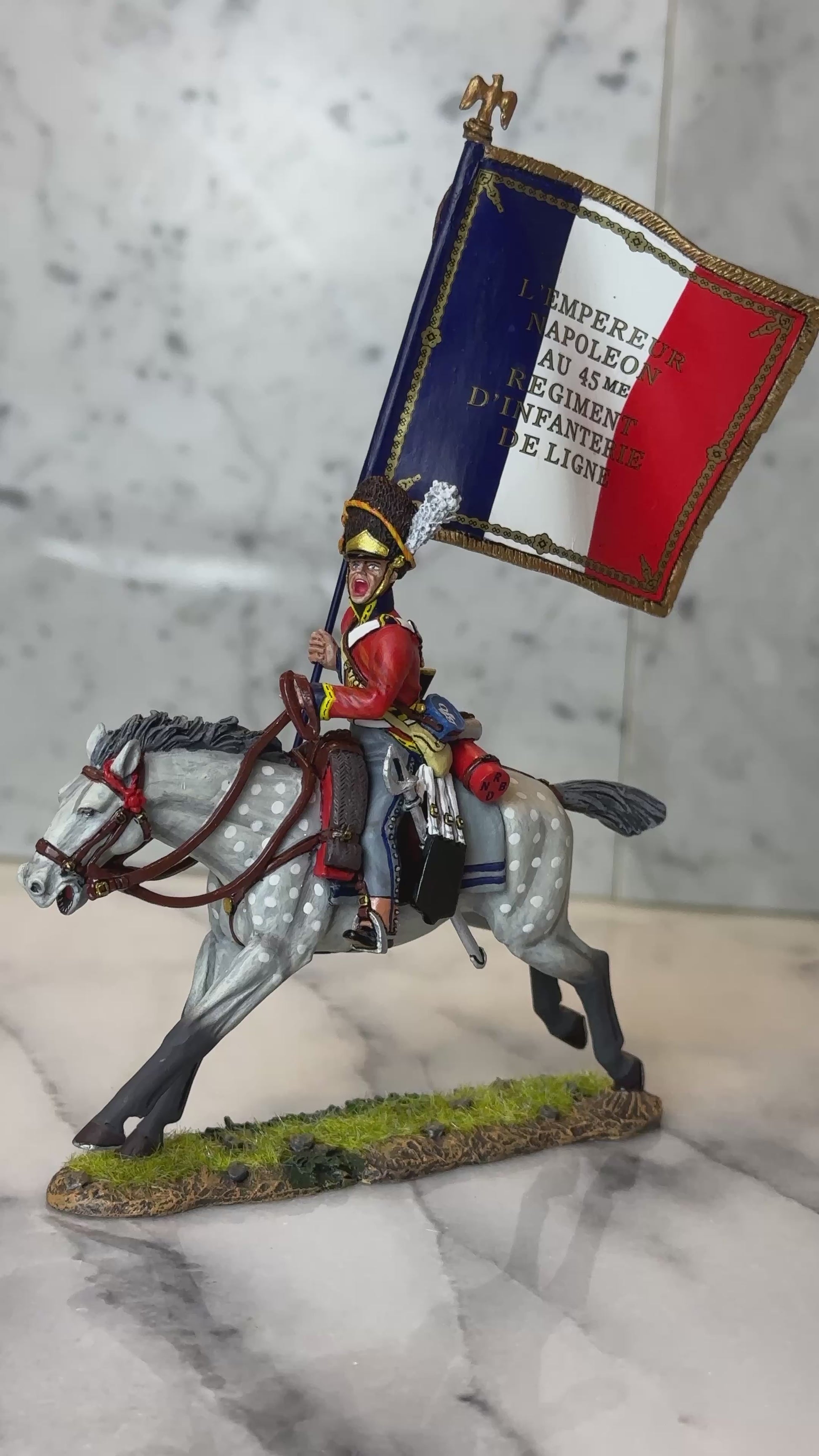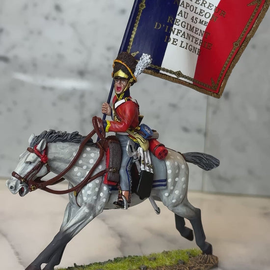 Clutching the seized tricolor of the 45th Line Infantry, Ewart is portrayed galloping from the battlefield with his prized trophy. The flowing standard, sculpted in motion, adds height, color, and historical significance to the piece while symbolizing the chaos and valor of close-quarters cavalry combat.