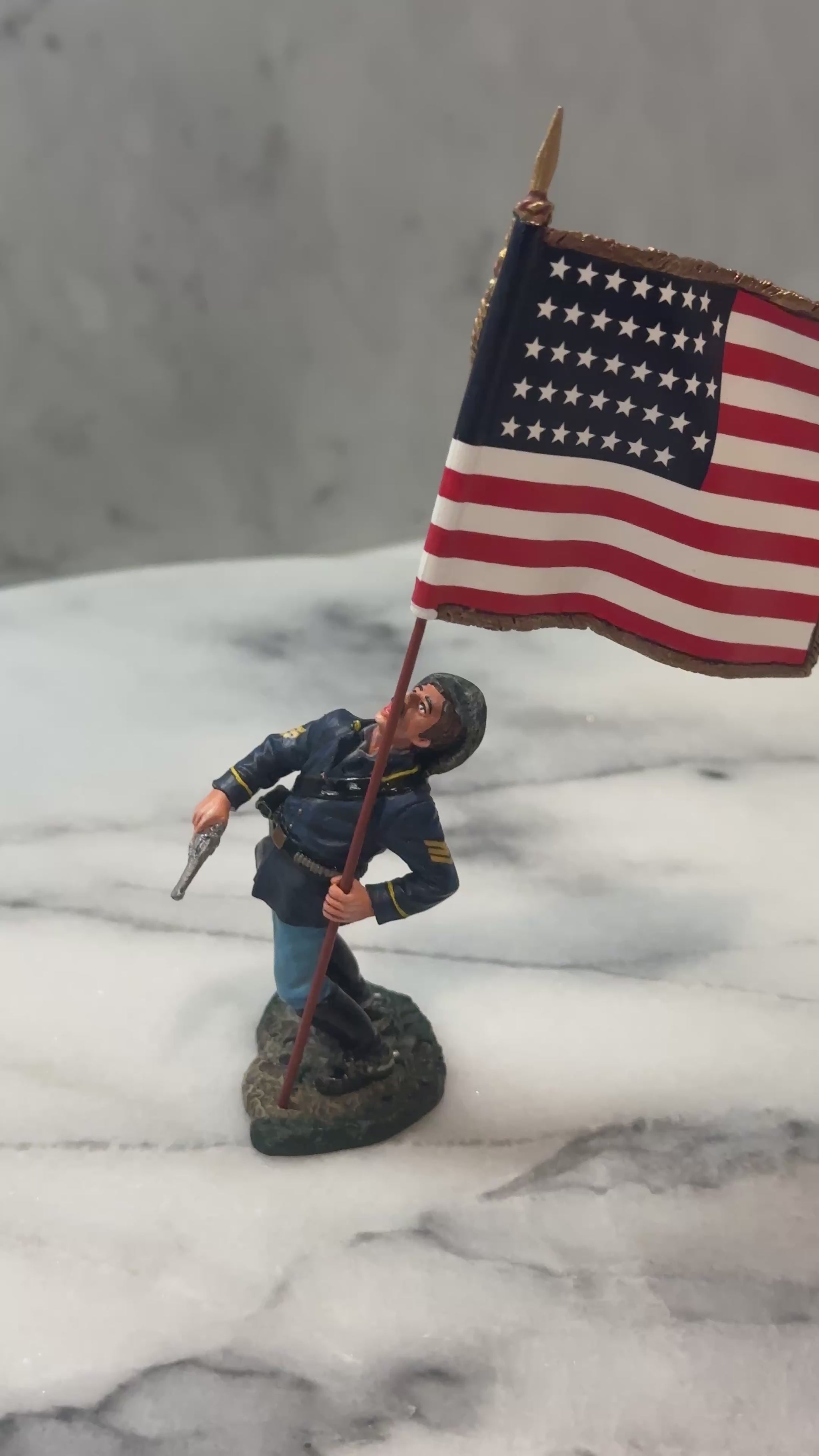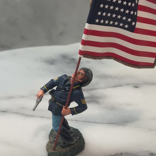 Commemorating one of the most storied and tragic moments in American military history, this figure depicts Sgt. Robert H. Hughes during the Battle of the Little Bighorn, June 1876. A member of the doomed 7th Cavalry, Hughes is shown carrying the 36-star National Colors in one hand while wielding his Army Colt revolver in the other. As he reels backward, struck by a fatal wound, his expression and posture convey the chaos and sacrifice of the infamous battle. Finely hand-painted in 1/30 scale, this matte-finish toy soldier figure captures a fleeting and heroic moment in the struggle against overwhelming odds. An essential piece for any collector of American frontier military history.