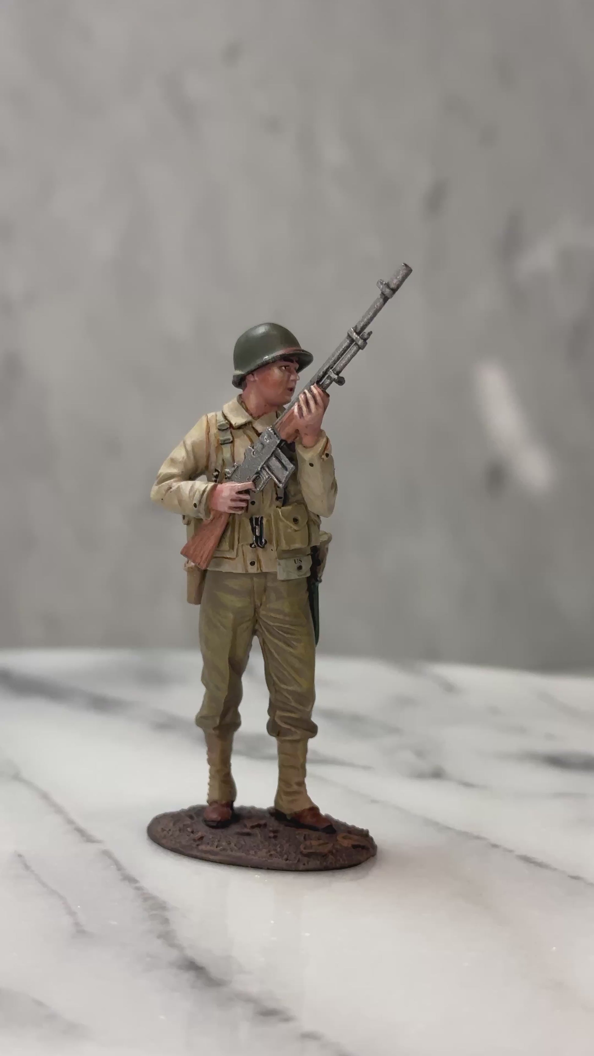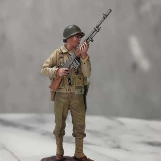 Take a step back in time with our meticulously crafted 1/30 scale model of the U.S. Infantry BAR Man, Standing Alert. This figurine, designed with a matte finish, captures a significant moment in military history. It features a soldier poised in alert, equipped with the iconic M1918 Browning Automatic Rifle, a pivotal weapon designed during WWI by John Browning. Originally intended for "walking fire," the BAR was a challenge to master due to its open bolt operation and strong recoil—attributes meticulously represented in this model.