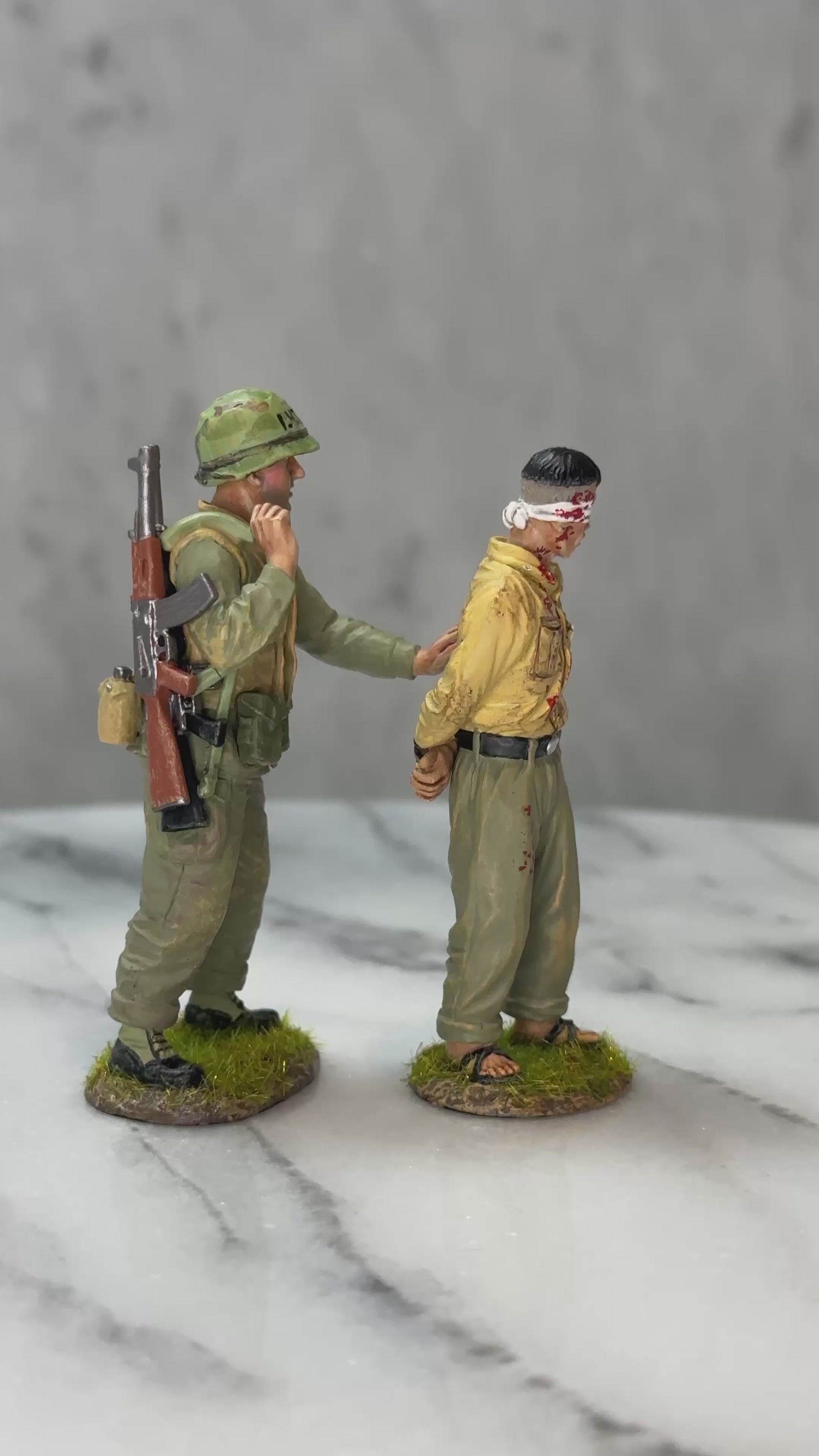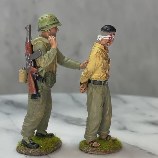 Inspired by an iconic photograph captured by British war photographer Don McCullin during the Battle of Hue in 1968, this dramatic two-figure set depicts a U.S. Marine escorting a captured North Vietnamese soldier. The wounded prisoner, blindfolded and hands bound, is pushed forward by a Marine whose flak jacket features a humorous patch of Alfred E. Neuman—MAD Magazine’s grinning mascot—with the phrase “What Me Worry?” scrawled beneath it. The Marine carries both his own M16 and the prisoner's AK-47, symbolizing the tension, exhaustion, and surreal contrasts often experienced in combat. This poignant vignette offers a powerful snapshot of the Vietnam War’s human dimension.