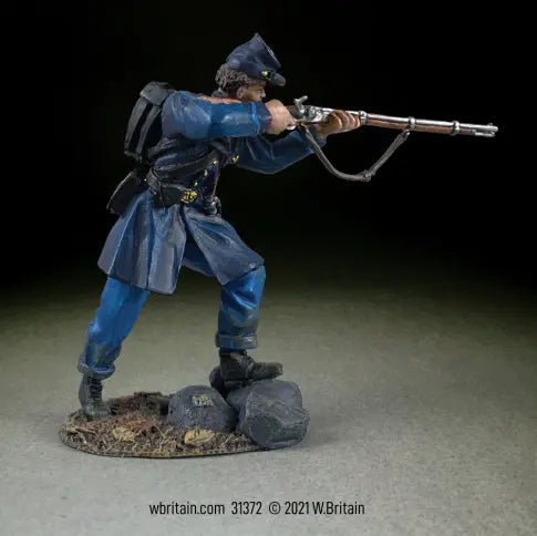 The figure shown is clad in the standard issue frock coat and sky-blue trousers, common among Federal troops, especially early in the war. His stance, firmly planted behind a rocky base, reflects the discipline and resolve of a Union line soldier in the thick of battle.