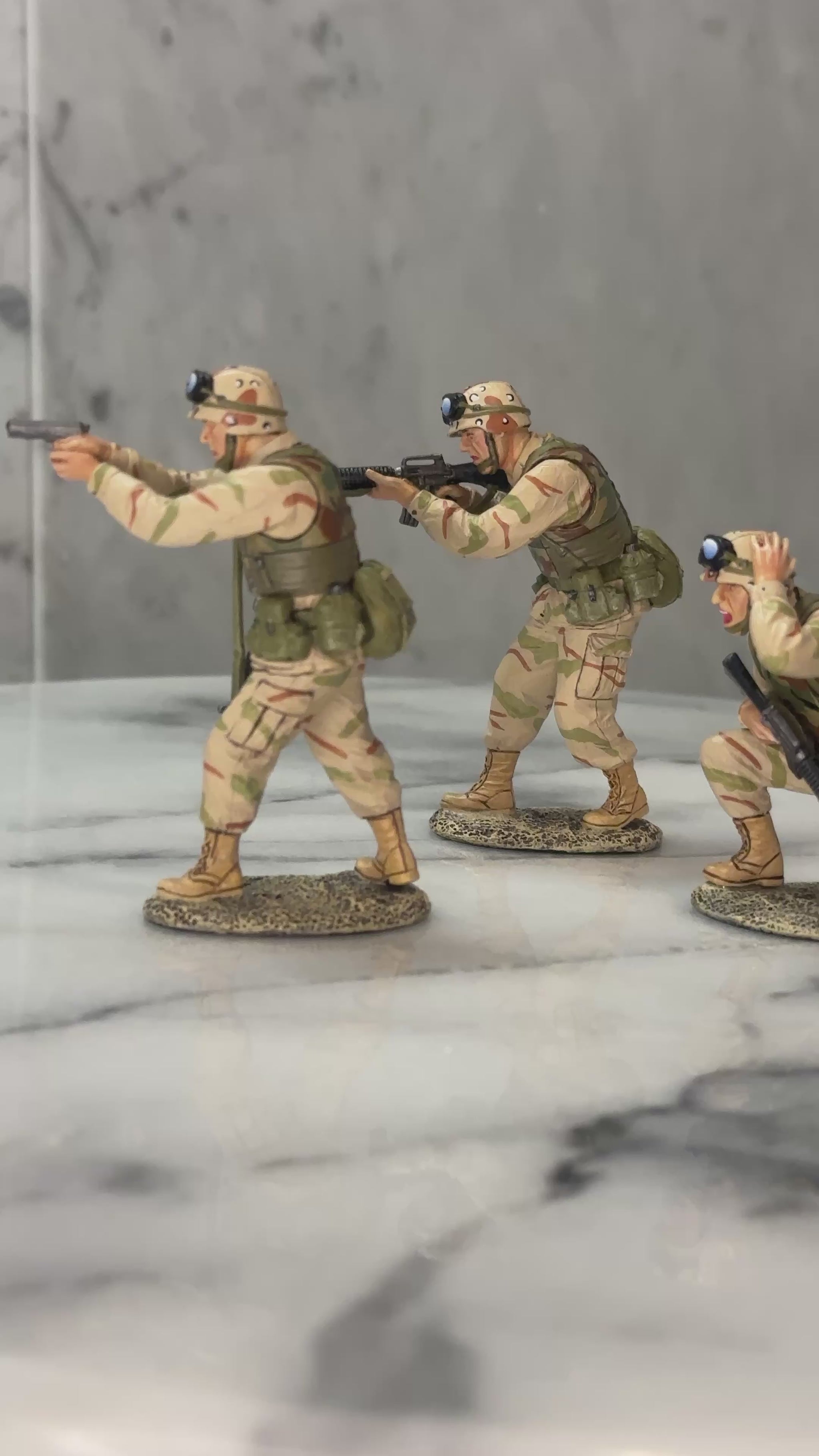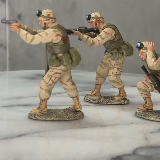This dynamic three-man fire team captures the intensity and coordination of U.S. Army Rangers operating in urban combat during the Battle of Mogadishu. Each figure is meticulously sculpted and hand-painted, reflecting the authentic Desert Battle Dress Uniform (DBDU) and combat loadout of 1993-era Rangers.
