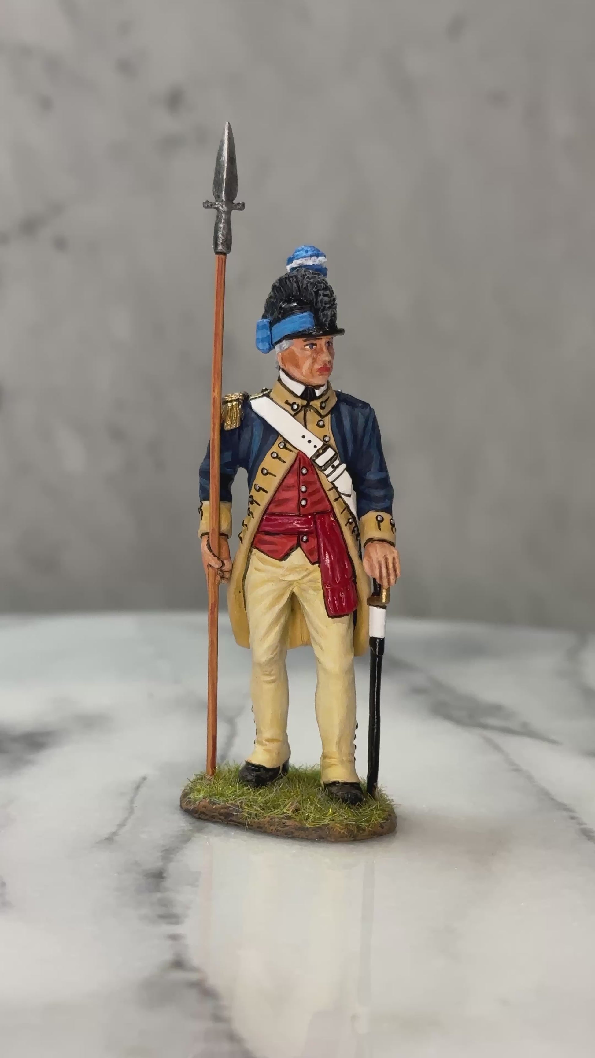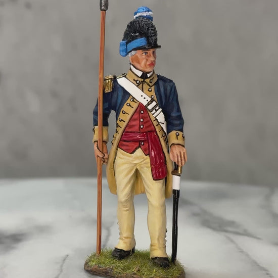 This figure, dressed in the Guard’s distinctive blue coat with buff facings and red waistcoat, captures the refinement and resolve of a Continental officer on campaign. The pike—a traditional symbol of authority—serves as both weapon and emblem of leadership. Perfect for dioramas or collections depicting Revolutionary command and discipline.